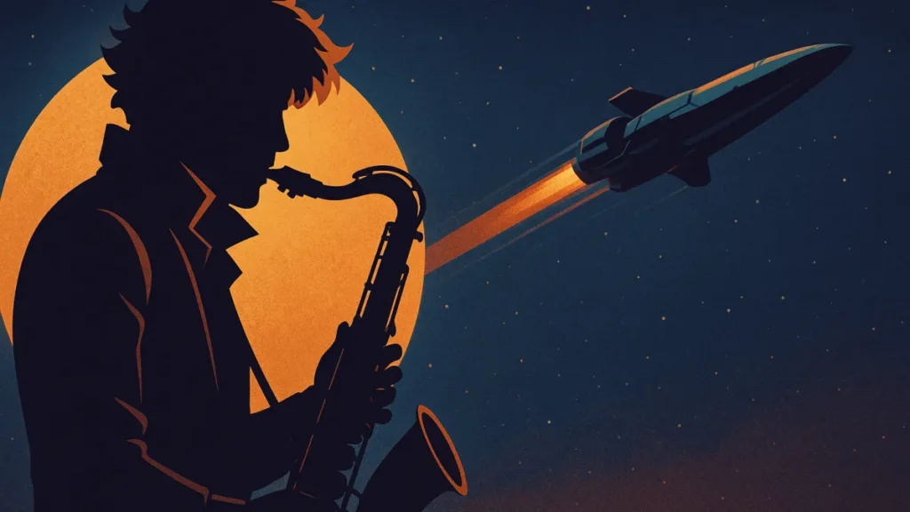 O jazz em Cowboy Bebop funciona como comentário emocional: acelera momentos de ação e desacelera cenas de revelação. Ouvir a trilha separada da imagem já vale a pena para entender a construção da série.